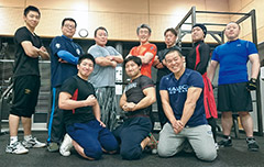 柔道重量級のM氏、ボディーメイクにはまったH君、私を筋トレに引き込んでくれたH君、私、顧問で超人ハルクの師匠T氏 ▷ 元ボディービルダーで私の1歳年上の52歳、170sを担いでスクワットをこなす。警察官のS氏、その部下のS君 ▷ 男子新体操の元インターハイ選手。