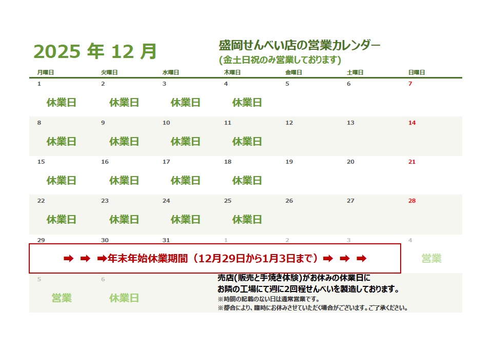 各工房・盛岡せんべい店12月の営業日のお知らせNEW