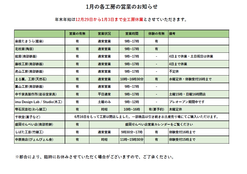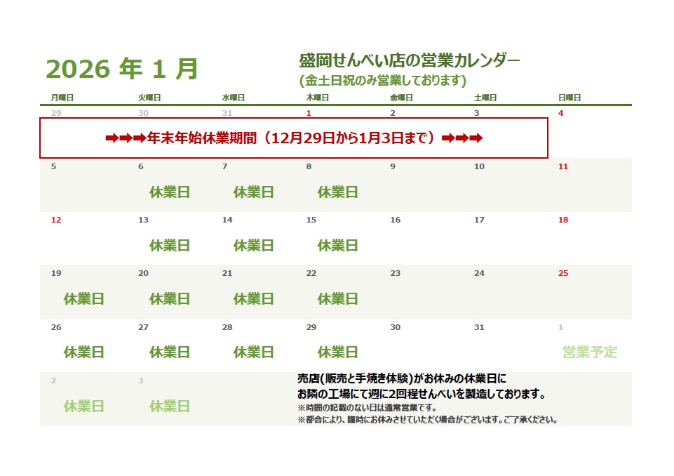 各工房・盛岡せんべい店2026年1月の営業日のお知らせNEW