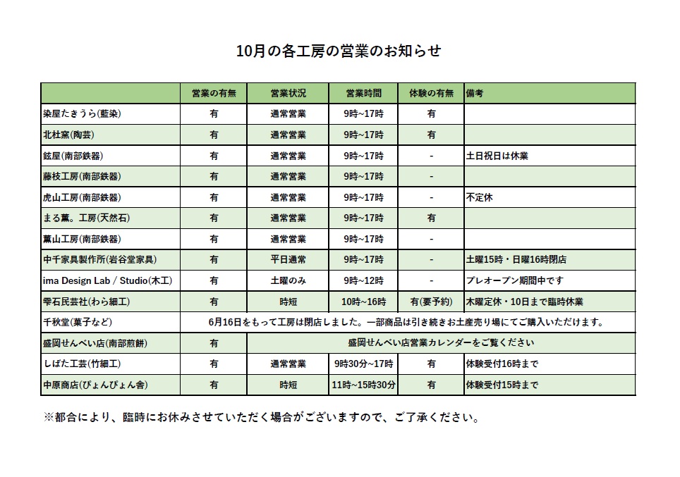 各工房・盛岡せんべい店10月の営業日のお知らせNEW