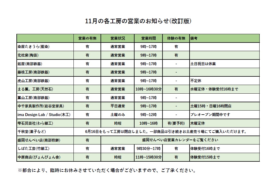 各工房・盛岡せんべい店11月の営業日のお知らせNEW